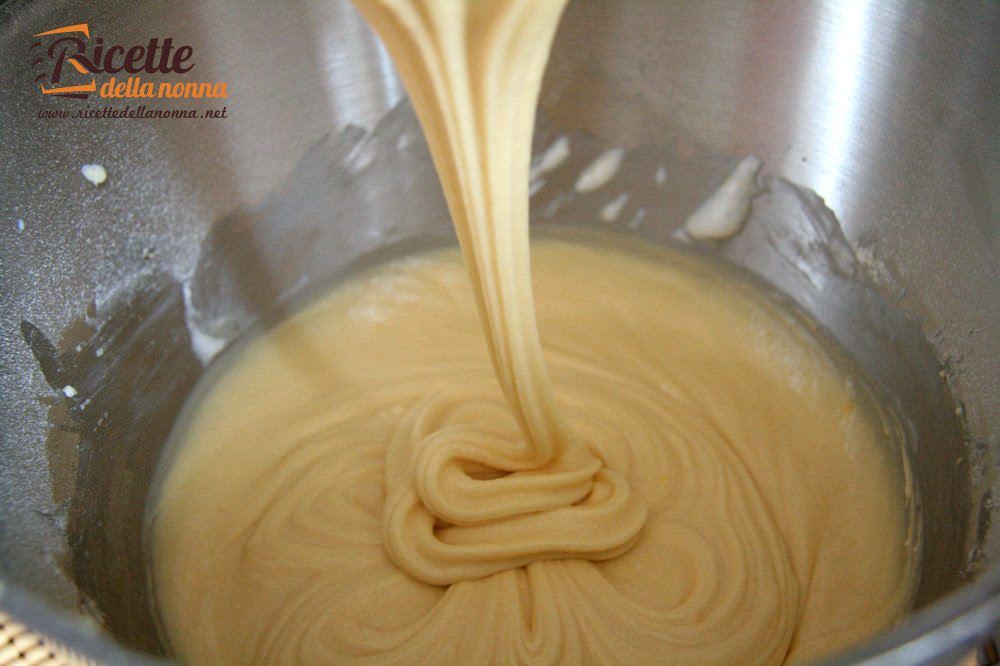 Aggiungete il bicchiere di latte e amalgamate, quindi unite a poco a poco al composto la farina e il lievito entrambi setacciati. Dopo aver amalgamato tutta la farina continuate unendo anche il burro a pezzetti, che deve essere a temperatura ambiente.
