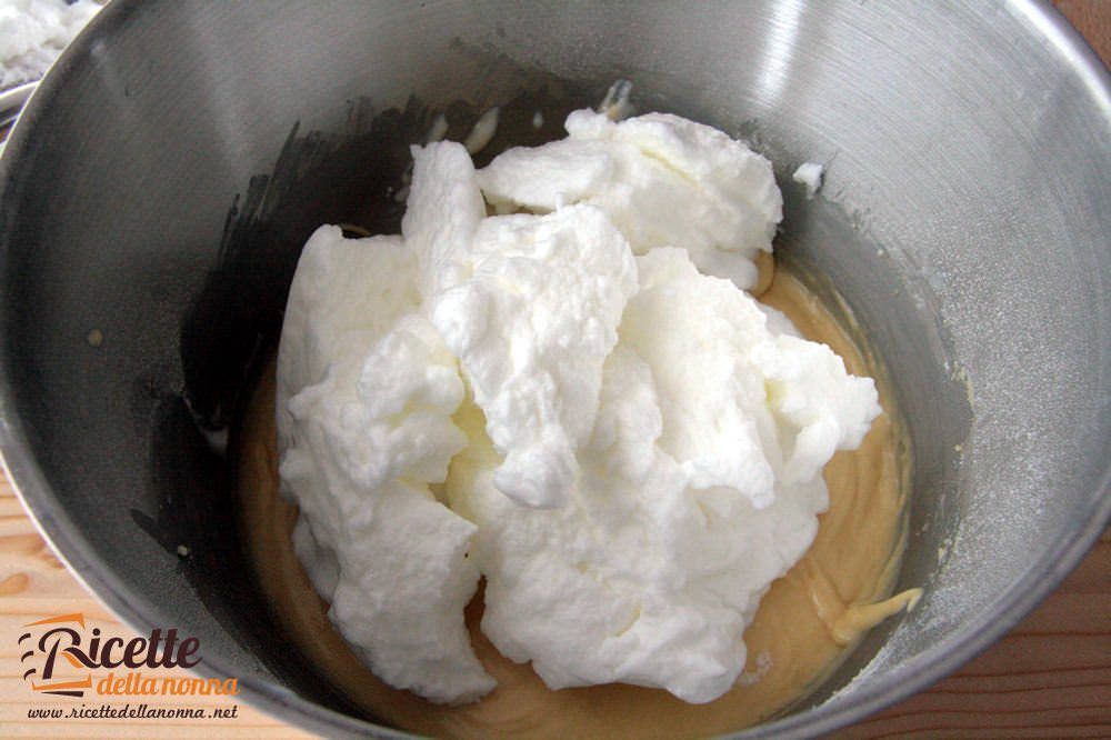 Infine unite lentamente le chiare montate all’inizio. E’ importante fare questa operazione con molta attenzione, dato che da questo dipenderà la morbidezza del vostro ciambellone. Mescolate con delicatezza con una paletta di silicone dal basso verso l’alto fino a che non le avrete unite tutte.