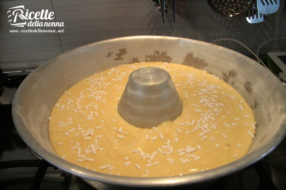 Rovesciate il composto in una tortiera da ciambellone imburrata e infarinata. Le dosi di questa ricetta si riferiscono ad una tortiera di 28cm di diametro.